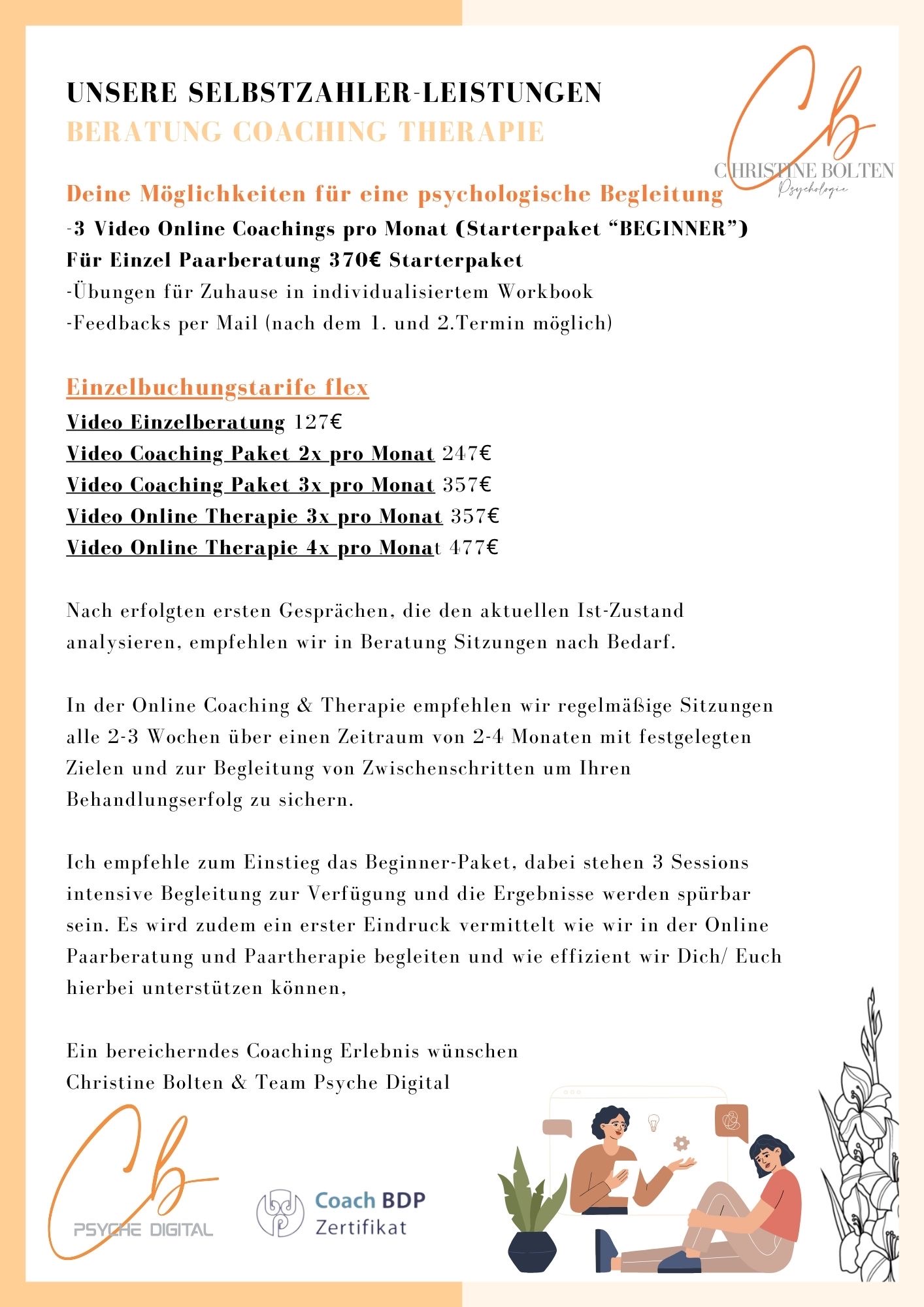 Flexibilität und Zugänglichkeit der Online-Paartherapie: Profitieren Sie von einer flexiblen Termingestaltung und der Möglichkeit, Therapiesitzungen von überall aus wahrzunehmen – ideal für beschäftigte Paare oder Fernbeziehungen.